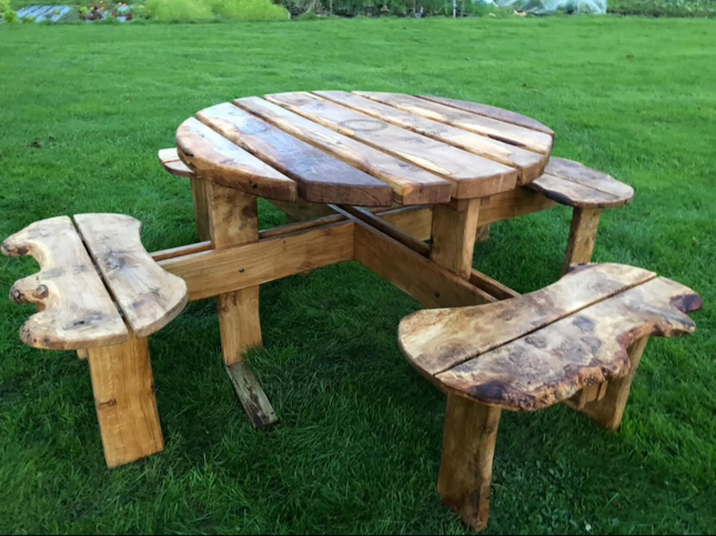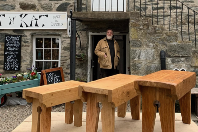 He has furnished grand houses and gardens around Scotland including dining tables for Blair Atholl and Taymouth Castles as well as many more modest homes, as he has something to suit most budgets. Currently he is working on a massive table and benches made from the Douglas Fir tree which once held the title of Scotland’s tallest Tree which will be donated to Dunkeld & Birnam In Bloom for St. Ninians Gardens outside our shop.